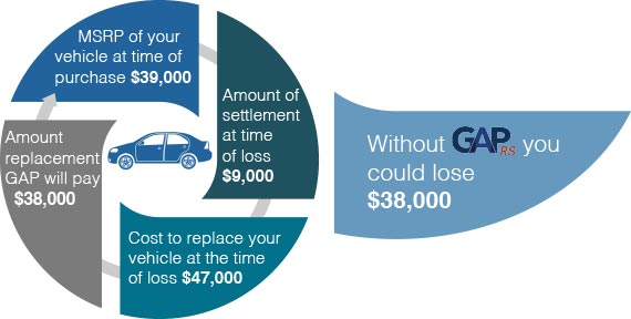 GAP RS will pay the difference between the depreciated settlement your receive from your primary insurance carrier and the MSRP of a new vehicle.