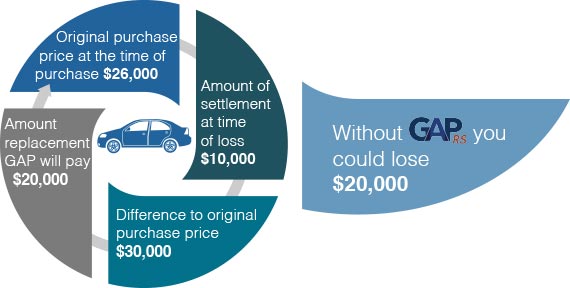 GAP RS will pay the difference between the depreciated settlement your receive from your primary insurance carrier and the original price of your vehicle.