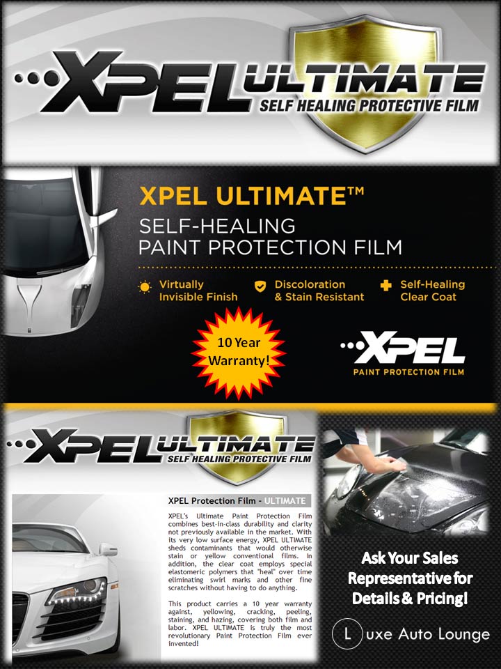 Add extra protection against stone chips and improve the resale value of your vehicle with our Xpel Paint Protection Film. Available in several kits and combinations, paint protection film has gained much popularity in recent years and is a more effective option than the traditional bug defelctors of the past. For more information and for pricing and availabliity for your vehicle, please contact your Luxe Auto Lounge representative.